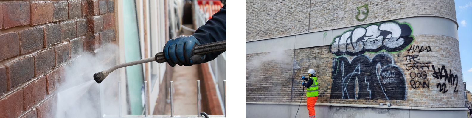 Once sprayed onto the surface, the liquid dries instantly. The high-temperature strain of water effectively removes all traces of graffiti, chewing gum, pigeon guano, oil and biological growth without penetrating the brick, resulting in no further damage.